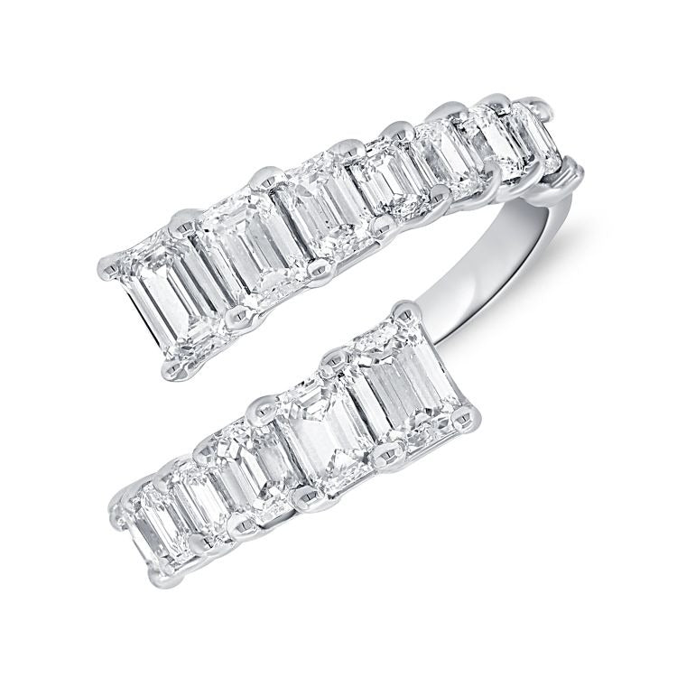 14k Gold 2.11Ct Emerald Cut Diamond By Pass Ring with 14 Diamonds, available in White, Rose and Yellow Gold