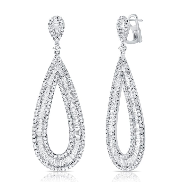 14k Gold 5.17Ct Baguette and Round Diamond Pear Shape Dangle Earring, available in White, Rose and Yellow Gold