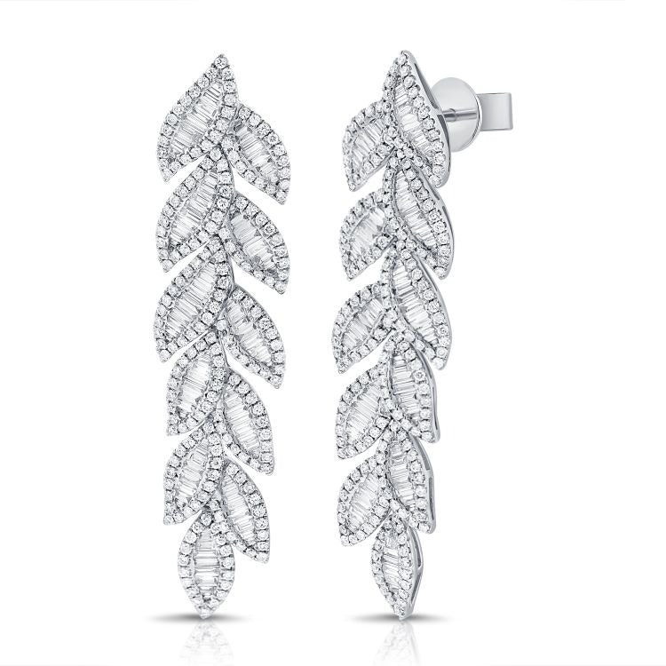 14k Gold Leaf Earring with 2.98Ct Baguette, 3.35Ct Round Diamonds, available in White, Rose and Yellow Gold