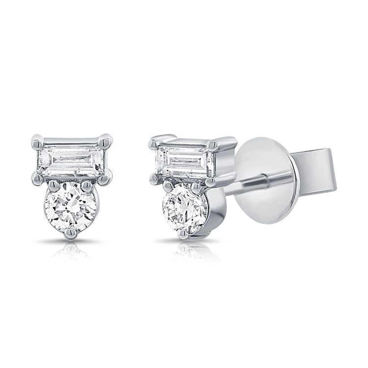 14k White Gold 0.14Ct Baguette and Round Diamond Earring