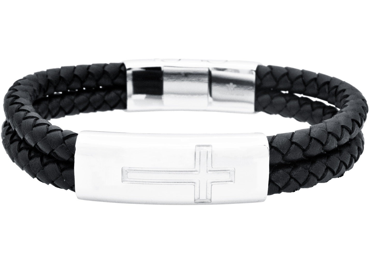 Men's Double Strand Black Leather Stainless Steel Cross Bracelet