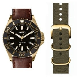 Shinola Bronze Monster 43MM Gift Set, Black Dial, Brown Leather and Olive Green Nylon Strap