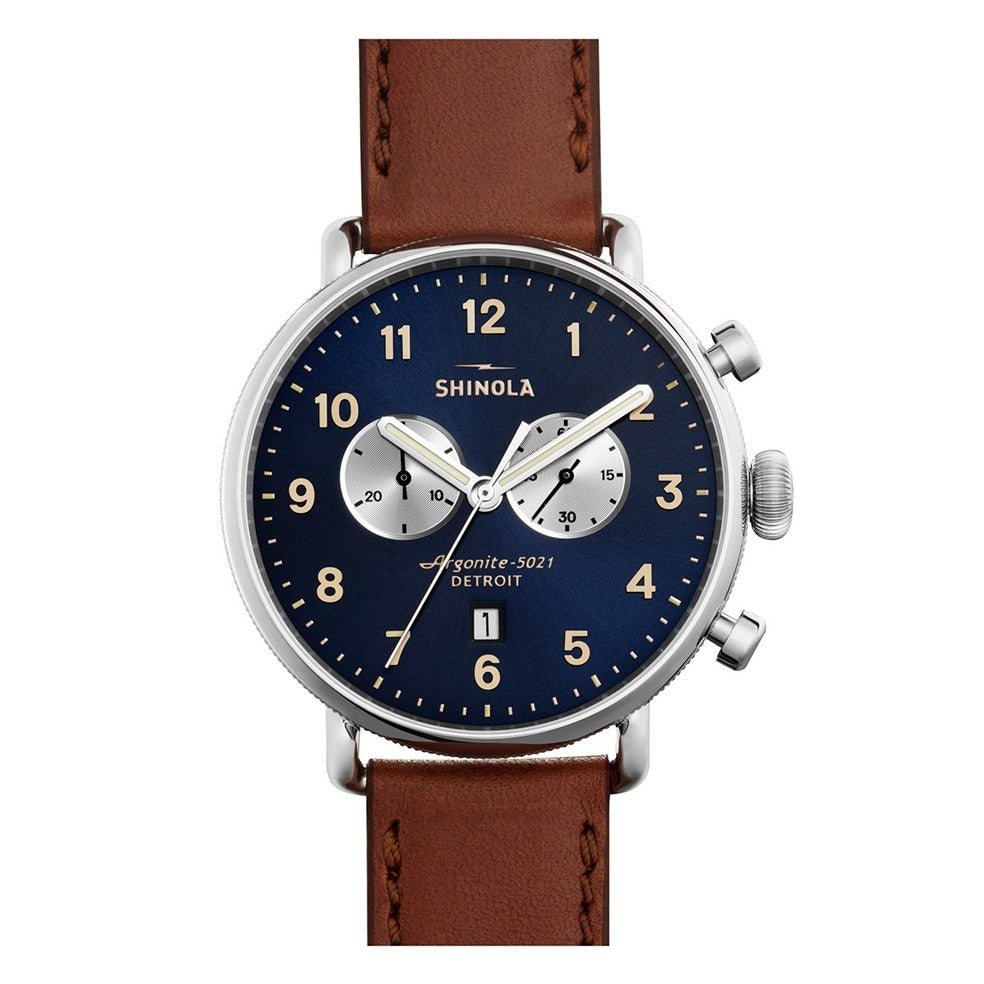 Shinola Canfield Chrono 43mm Polished Stainless Steel, Midnight Blue Dial, Cognac Leather Strap